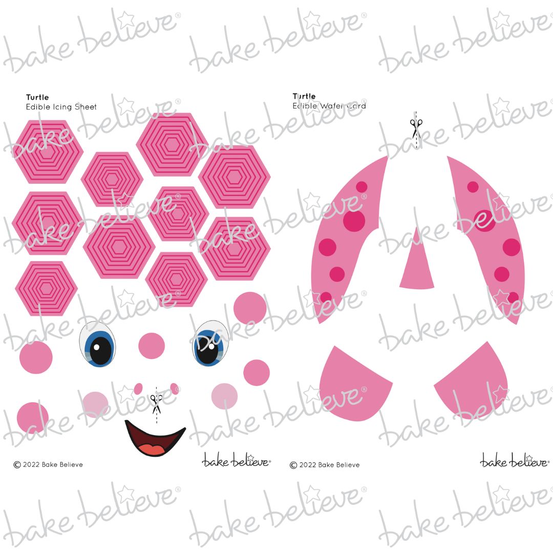 Our Turtle Edible Image Set comes with edible images on an icing sheet (to place on cake like stickers) and wafer card sheet (to stand tall on the cake like toppers). Simply cut it out with a craft knife or scissors and apply it to your cake.